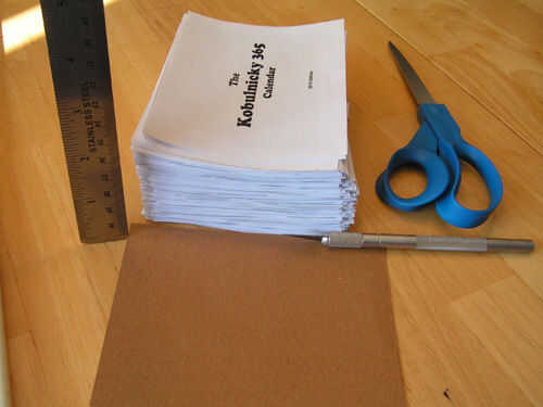 Por último, cortar un trozo de su cartón/cartulina fina para emparejar las dimensiones de las páginas del calendario y en la parte posterior de su pila, después su página final. Esta es la parte posterior de su calendario que finalmente se pega al soporte.
