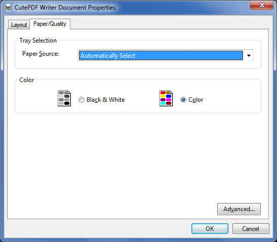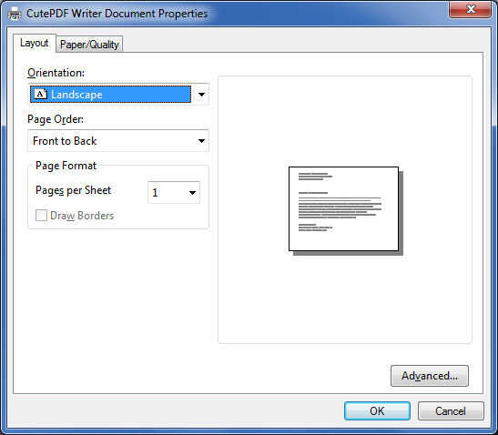 Haga clic en el botón Propiedades para abrir las opciones de PDF writer. En la ficha Diseño, asegúrese de que la orientación es paisaje. En la ficha papel/calidad, asegúrese de que el Color es seleccionado (no blanco y negro).