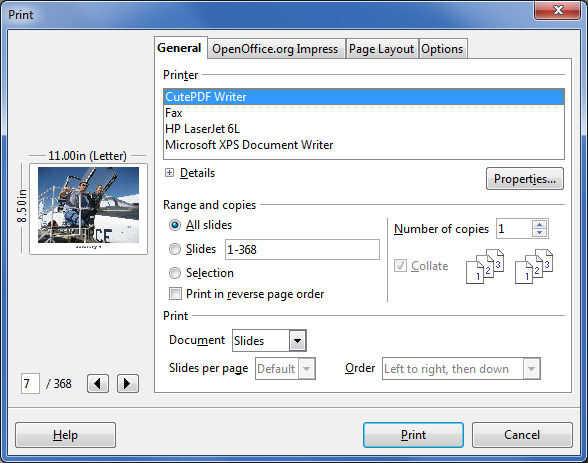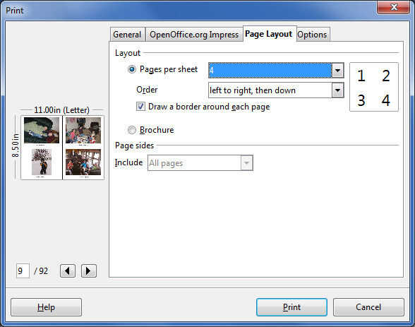 Así en este paso, es necesario utilizar la opción exportar PDF en el menú Archivo para crear un PDF estándar con una diapositiva por página. (Si esa opción no está presente en el menú archivo en Open Office impresionar, debería ser posible
