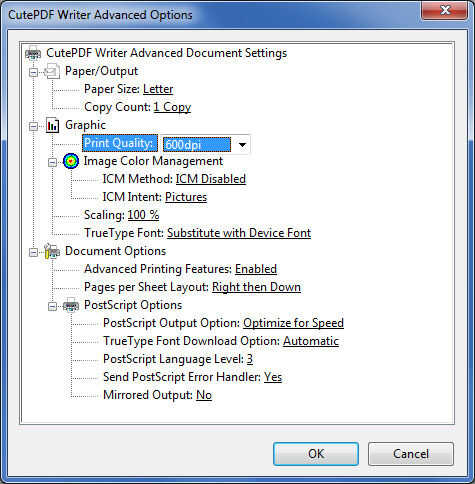 Haga clic en el botón avanzadas para comprobar las opciones de salida PDF. Los valores predeterminados aquí probablemente estará bien, pero usted puede asegurarse de que la calidad de impresión se establece en al menos 600dpi. Haga clic en aceptar hasta volver al primer cuadro de diálogo Imprimir.