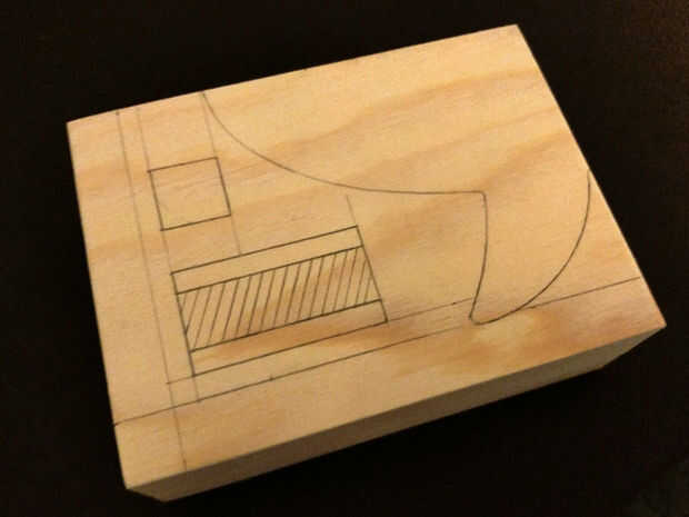 Simplemente dibujé las formas externas (pantalla, la posición de la burbuja,...) directamente en la caja de madera y tallado el agujero rectangular para la pantalla utilizando una sierra dremel. He añadido cuatro agujeros para sostener la pantalla con algunos tornillos diminutos.