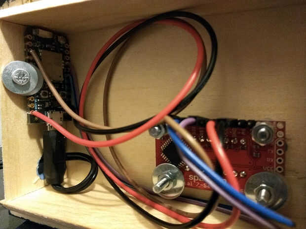 Pinta las diferentes piezas de madera y montar los componentes electrónicos dentro de la caja, utilizando los agujeros y algunos tornillos (tenga cuidado de usar anillos de plástico para proteger los componentes electrónicos y no apretado demasiado!).