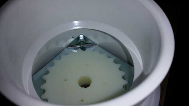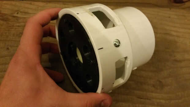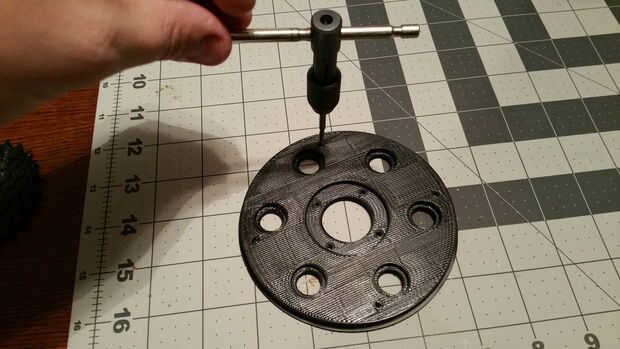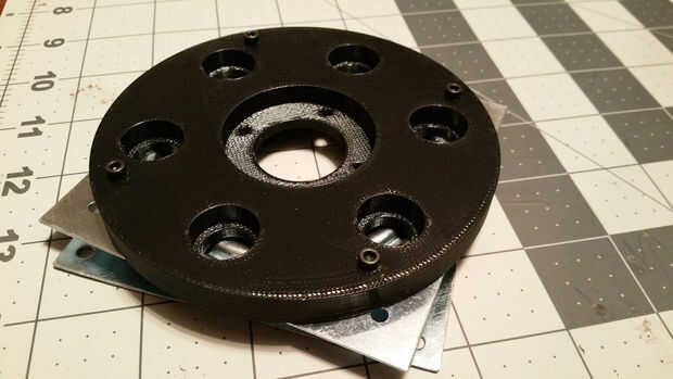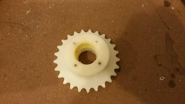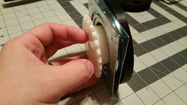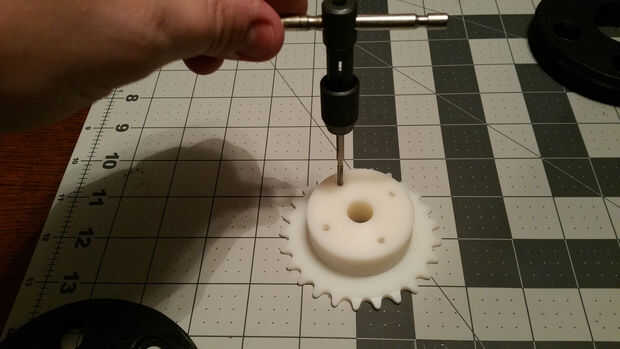 Lo primero que decidí hacer fue diseñar un anillo que le fijan los barriles a mi rodamiento. Diseñé la "parte trasera barril Ring2" abajo y 3D imprimió. Luego había aprovechado el 4 interior y exterior con 4 orificios con un toque de #4. Entonces había jodido el trasero barril Ring2 un lazy Susan de 4" teniendo con los 4 tornillos exteriores. Una vez que fue hecho marcó, perforado y 4 orificios en un piñón de 25 dientes nylon roscado. Tengo un reductor de PVC de 3-4" acoplador y marcado el cojinete con el interior diámetro del acoplamiento y el anillo guía cañón del cojinete cortar las esquinas de metal tan la Frotaría no como las vueltas del cojinete. En el lado del piñón plegar las esquinas para que todo se desliza en el 4" lado del acoplamiento. Entonces yo había asegurada el cojinete en el lado del acoplamiento con 4 tornillos. Finalmente corté 2 ranura en un lado del acoplamiento para que la cadena podría viajar a través. También tuve que perforar el centro de la rueda principal hacia fuera a aproximadamente una pulgada por lo que el barril podría caber a través más adelante.