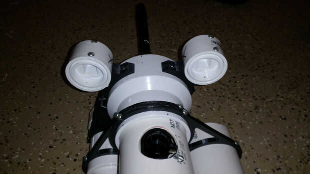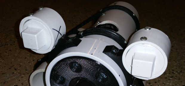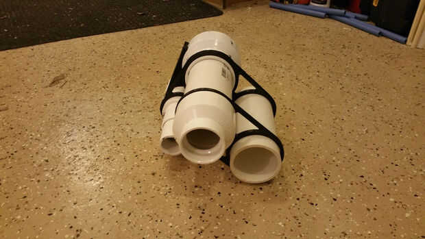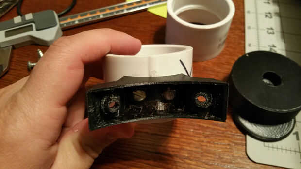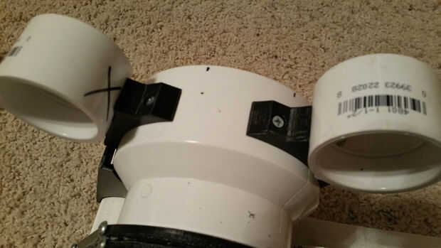 El siguiente fue montar los 2 puntos donde el mango se adjuntar más adelante. Usé 2 piezas de 1-1/2" acoplamiento y diseñado una base para conectar a la cámara principal. Primero atornillan los acoplamientos a la base de impresión 3D luego atornillar la base a la cámara principal. Entonces puse un tapón dentro de cada uno de los acoplamientos y había atornillada en su lugar. Estos permiten las piezas cuadradas ser montado fácilmente en a más adelante con el mango.