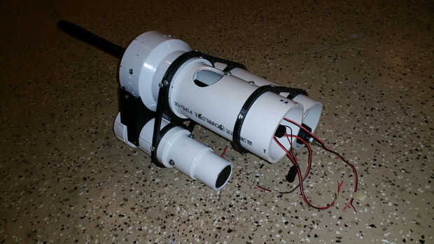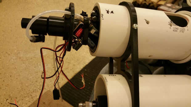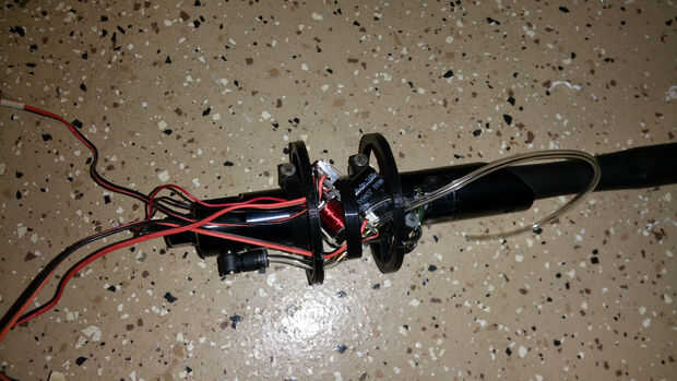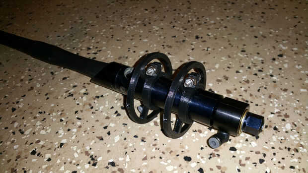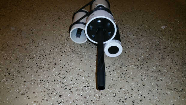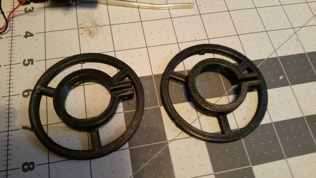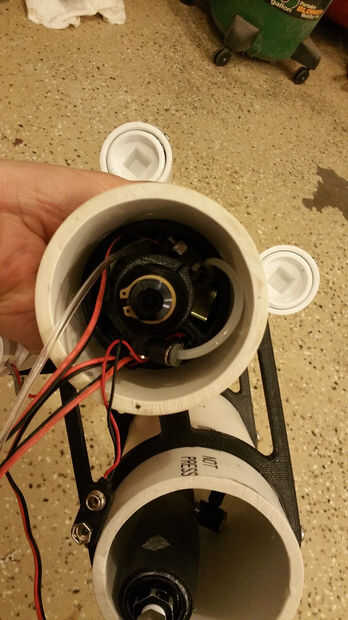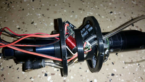 En las armas tenía que localizar el poder, programa y gatillo botones y soldar un cable a ambos lados de estos interruptores. Asegúrese de etiquetar estos para que sean fáciles de encontrar más adelante. También tuve algunos 1/8" y 5/32" tubo de forma que podría extender las mangueras para alcanzar las nuevas ubicaciones para el regulador y tal. Para fijar la pistola en el interior de la cámara principal que tenía que diseñar anillos más para apretar a la pistola con pernos para apretar la pistola y los anillos tienen 3 agujeros para montar en el interior de la carcasa de la cámara principal. Una vez instalados los anillos, los componentes electrónicos deben ser abarrotado entre ellos y atado a zip. Ahora el cuello de alimentación necesita salir por lo que la pistola puede ser deslizada en la cámara principal.