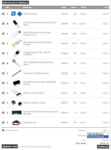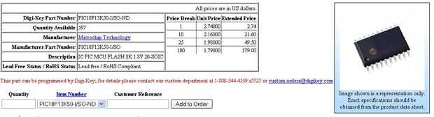 He ido y he publicado capturas de pantalla de algunos lugares donde puedes comprar los componentes. Algunos componentes no podían comprarse 1 o era más barato en cantidades más altas, por eso se pueden ver algunas piezas adicionales en las fotos. Muchas de las piezas pueden adquirirse a un buen precio en www.dipmicro.com. El costo de cada producto será etiquetar en las fotos de abajo. Con todas estas partes, no incluida la Junta, vino a $38,11 a comprar todos los componentes de este cronógrafo con envio todo incluido excepto el PIC18F13K50 comprada en Digikey. Entonces sería un par dólares más para el tubo de PVC. También, si usted quiere ahorrar $3,39, usted puede comprar pantallas de LCD 16 x 2 en eBay por $2.99 incluyendo el envío.