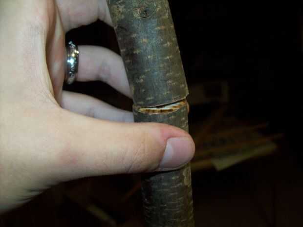 cortar un trozo de tubería a la longitud que desee su tolva más una pulgada (para enchufe y adaptador de alimentación de cuello). se trata de su tubo de tolva. Limpie las rebabas con el cuchillo. uso el cuchillo corte la pieza de árbol joven a tamaño y forma, capa epoxi y ajustarla en un extremo del tubo de la tolva (pedazo largo de PVC guardar las bolas de pintura), de epoxy sobre y alrededor de los bordes, teniendo cuidado de no conseguir epoxi por parte de la tubería.