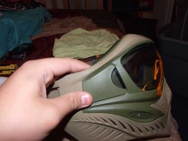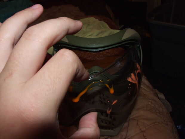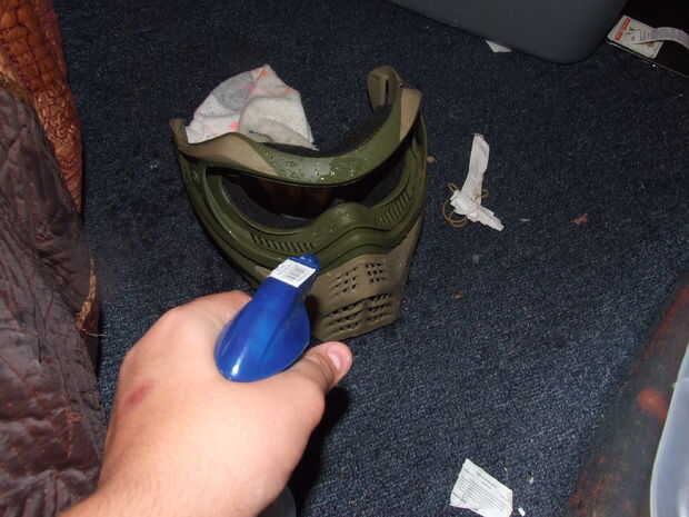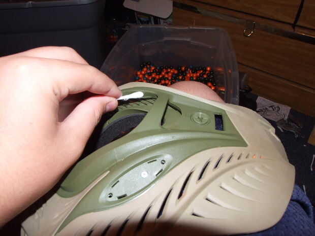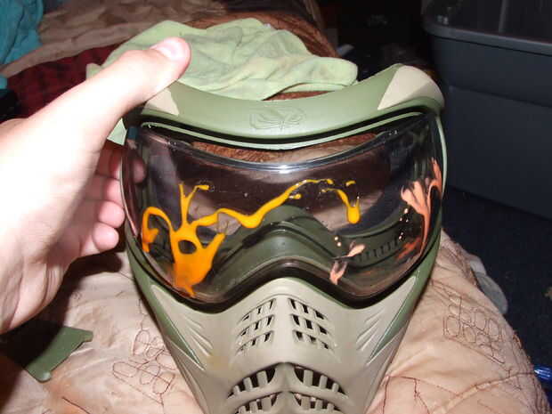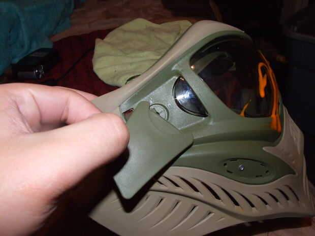 Primero quitó la 'ComfortPads del templo', que es el pequeños trozos de espuma que en la máscara por las orejas. Basta con salir de los agujeros. Ahora, dentro de sus oídos, desabroche la correa y tire de ella. Por otro lado hay una pieza dura de plástico que mantiene la lente, empuje la pieza, interior y este plástico duro pedazo voluntad sólo pop out. Repita en el otro lado. Apenas empuje la lente hacia fuera desde el interior, no deje caer su lentes. Si le caen los lentes, usted el riesgo de arañazos y romper sus lentes. Mascarilla de aerosol hacia abajo y seque con el trapo. Si la pintura es en los orificios de ventilación en la parte delantera, o por donde van sus lentes, use un q-Tip para limpiar la pintura lejos. Si haces esto en el campo, puede que desee omitir usar q-tips. Poner a un lado, para secar.