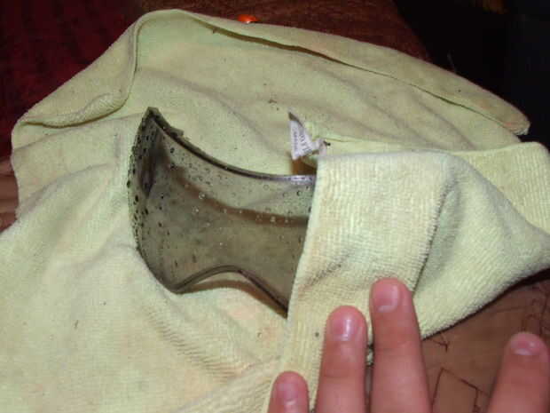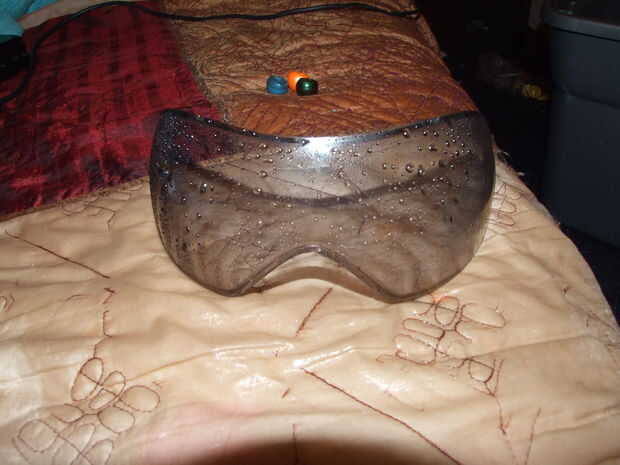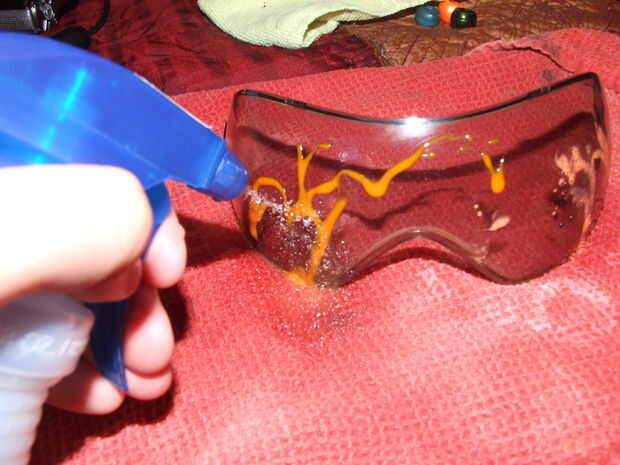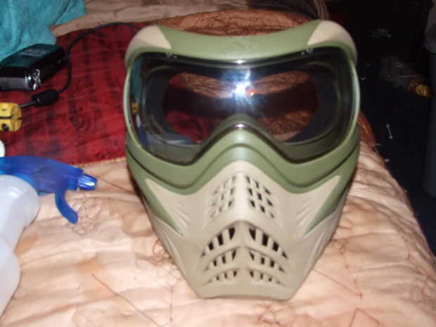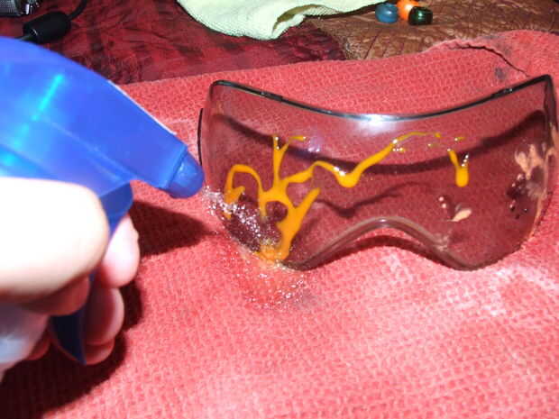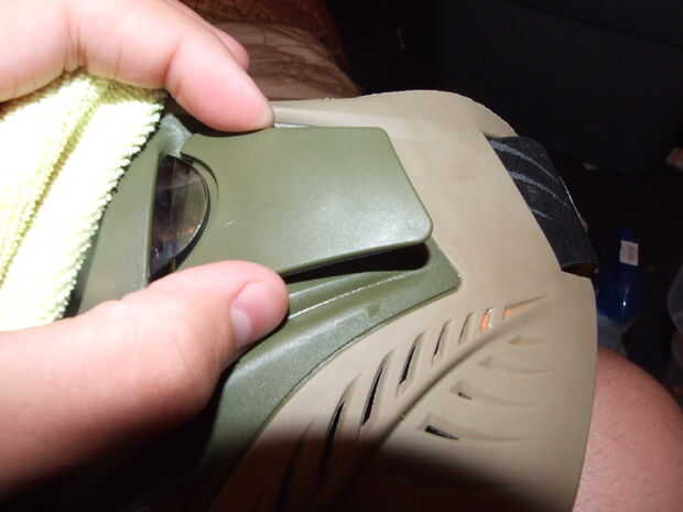 Colocar un trapo y coloque la lente en la parte superior. Rocíe la pintura apagado y limpie con el paño de microfibra. No secar con un trapo normal u otra cosa rayar sus lentes.  Asegúrese de que la máscara y el objetivo están secos. Ahora, introduzca la lente sosteniendo el paño de microfibra. Esto asegurará que hay no hay manchas en la lente. Ahora, poner su lado clips de nuevo y deslizan la correa en la máscara. Clip de la correa para las piezas laterales y luego añadir los clips del templo. Usted ahora tiene una máscara limpia y listo para jugar otra ronda de paintball. Recuerde que no se puede disparar, lo que no se ve. Mantener la mascarilla limpia, y se feliz todo el día.