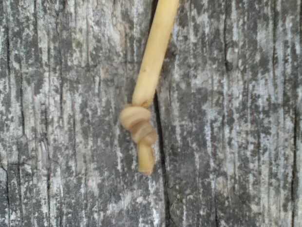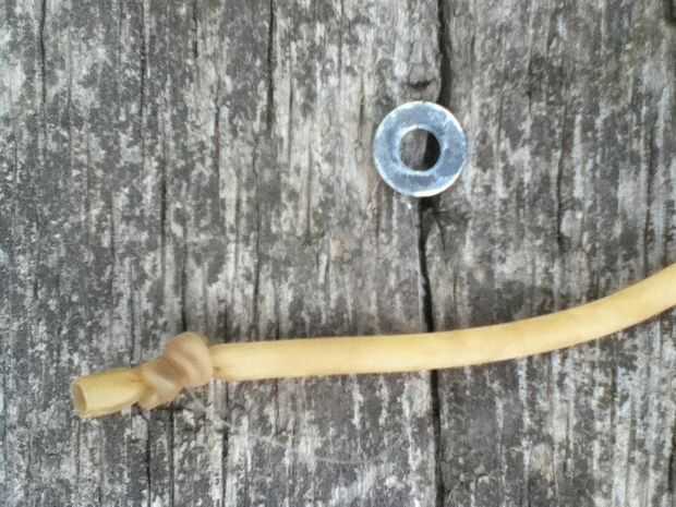 hacer un nudo en un extremo del tubo. Asegúrese de que es muy apretado, para que no salga pintura. Pruebe haciendo un nudo doble, para estar seguro. atar algunas lineas de pesca en esta final, aproximadamente 2 pulgadas más largas que el tubo. Ate el otro extremo a la lavadora. dejar esto de lado.