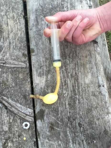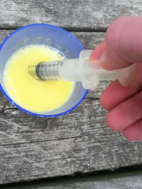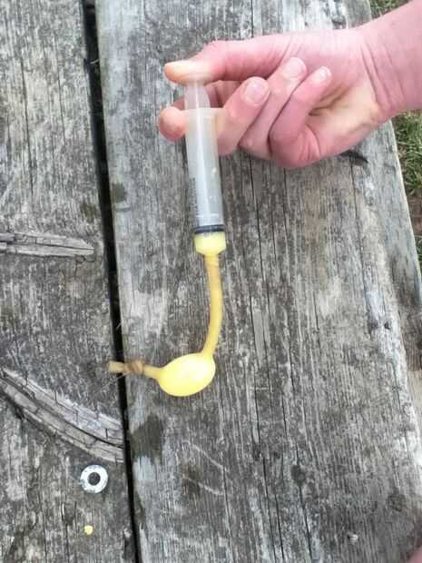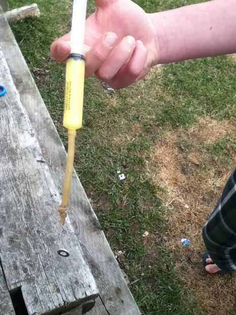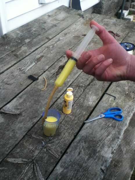 ahora, toma la jeringa y rellenar con pintura. trate de hacerlo con una mano, porque tendrás que hacerlo más tarde si no tienes ayuda a mano. Meter la jeringa en el extremo abierto del tubo. Apriete la pintura en el tubo. Si la pintura sale al final con la jeringa, plegar el tubo en sí mismo y vuelva a intentarlo.
