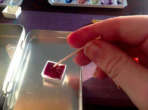 Utilice un palillo para agitar la pintura alrededor un poco para sacar las burbujas de aire y para entrar en las esquinas.