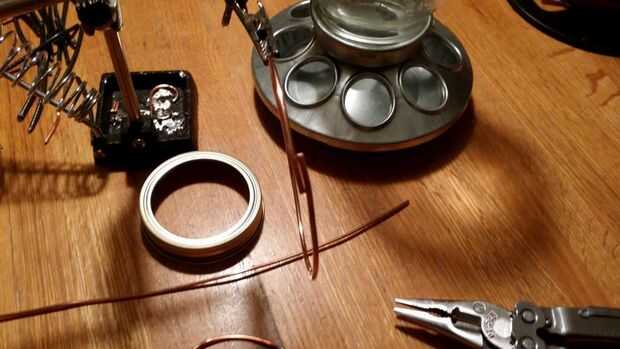 Una vez que está satisfecho con el ajuste del anillo sobre la boca del tarro. Corta el cable extra y pero los 2 extremos juntos. Usé un poco de paño de emory para alegrar el cobre y el dobbed un poco de resina en la zona mixta para que mi soldadura fluiría mejor.