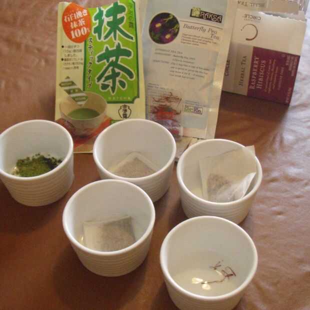 2-3 guisante de mariposa té + 1 hibiscus o bolsitas de té "frambuesa hibisco" cerveza juntos en agua caliente para cubrir