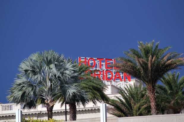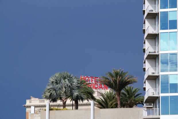 Hablando del este Hotel, su gran letrero de neón rojo viejo, incluso cuando están apagadas durante el día, se ve particularmente sorprendente contra el cielo azul purpley de una masiva tormenta entrante de Florida. También parece bastante prolijo conjunto entre palmeras y junto a las estructuras más modernas.