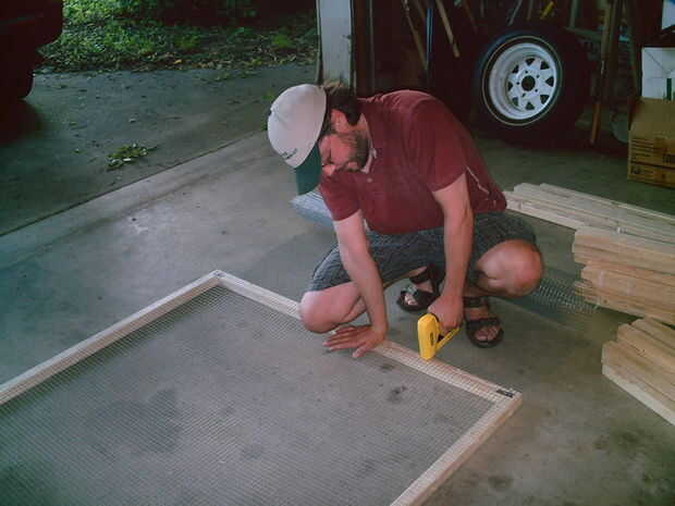 El acoplamiento de alambre es enrollado sobre el marco acabado simplemente y engrapado en con una pistola de grapas. Entonces el exceso de alambre es cortado con unas tijeras para chapa (o alambre cortadores si tienes mucha paciencia.)