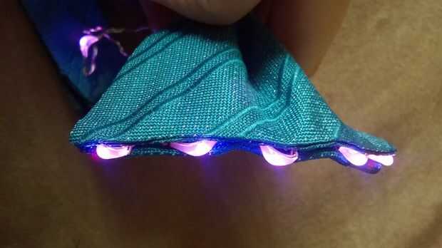 Si cose cuidadosamente la pajarita debe tener un borde acabado limpio con sin cables visibles. El único hilo que verás es el cable que viene desde la parte posterior de la mitad del nudo a la batería.