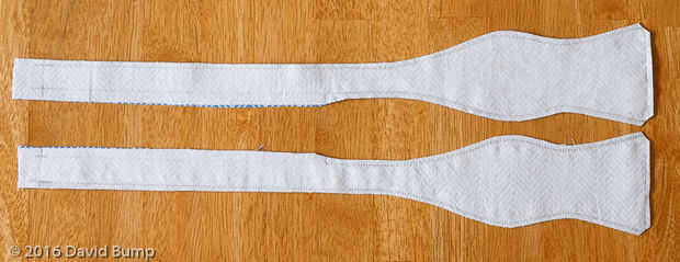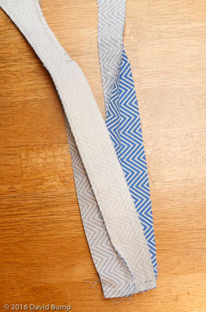 4. Es el momento para coser a su dos tie que tienen en el medio. Desplegar el sándwich en ambos extremos del collar y presionan juntos, con los lados de mostrar hacia uno hacia el otro. Si usted corta sus márgenes uniformemente, los extremos estrechos se alinean exactamente. Asegúrese de que las dos marcas del lápiz estrecho que indican el centro exacto de la corbata se alinean, o la corbata va a ser un poco más largo o más corto de lo que debería ser. Además, asegúrese de que las dos aletas de gruesa tela y entretela son dobladas en direcciones opuestas. Las imágenes hacen más evidentes. Esto crea una costura mucho más suave en el centro de la corbata, impidiendo tener una incómoda protuberancia en la parte posterior de su cuello cuando usted usa la corbata. Esto será más obvio en pasos posteriores, o si se omite este detalle particular.
