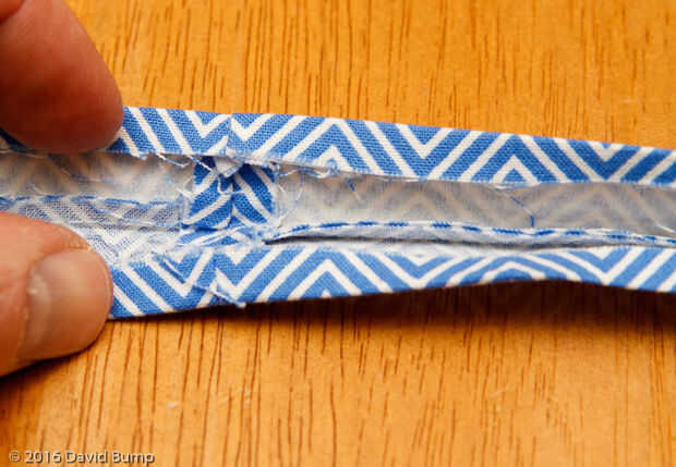 6. Eventualmente acabarás con un dobladillo arrugado de las clases a lo largo de ambos bordes inacabados de la sección del cuello y la corbata toda se pone plana, busca terminar.