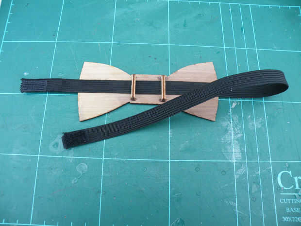 Pase el elástico a través de las fijaciones de la pajarita, luego pegar el Velcro en el elástico.