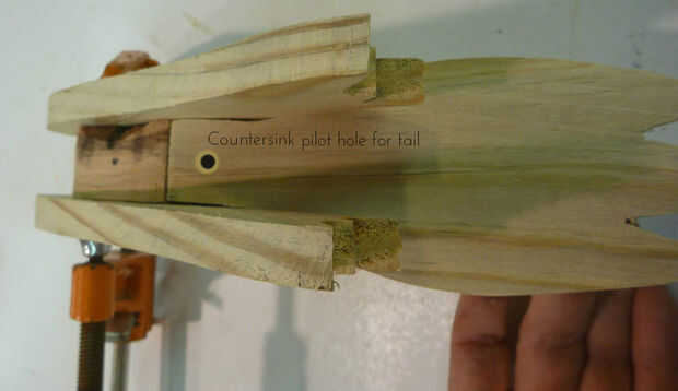 Taladre y avellane un agujero piloto para colocar la cola al cuerpo.