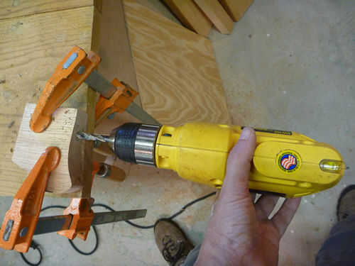 - Perfore un agujero a través del cuerpo para la cadena. Asegúrese de que esté lo suficientemente grande (yo usé un orificio de 3/8") por lo que la cadena tiene un montón de espacio de maniobra, pero no tan grande como para comprometer la estructura del pájaro de cuerpo. Si no tienes una prensa del taladro, abrazadera de la parte del cuerpo a su banco/mesa y use un taladro de mano. Mi taladro eléctrico tiene un nivel de burbuja que mantuve un ojo durante el taladrado. Comience con un más pequeño (1/4") poco y trabajo hasta el tamaño que desee. Si tratas de hacer todo de una sola vez, puede partirse la madera. Tómese su tiempo con esta parte.