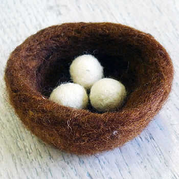 Para empezar, tire dos pies continuadas de lana de una canela paquete de mecha. Forma un nido de 3 dimensiones con las manos (aprox. 4" de diámetro). Corte un pequeño trozo de espuma para caber el interior de su nido y colocarlo dentro. Con su nido boca abajo sobre la estera de la espuma, comenzar la pieza de cepillo para Afieltrar por meter su aguja de fieltrar en la lana y vuelve a salir otra vez (la aguja irá ligeramente en el interior de la espuma). Para ello todo su nido durante cinco a diez minutos hasta que su nido ha comenzado a firma para arriba. Tomar la pieza de espuma dentro de su nido a y sintió el interior con su aguja de 5 a 10 minutos. Cuando esté satisfecho con la firmeza de su nido, coloque a un lado.