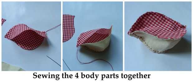 Hay 2 lados sin marcar en la parte inferior y la parte superior, no coser estas partes, como usted tendrá que mantener un área abierta para dar vuelta a la derecha hacia fuera después de coser todas las partes del cuerpo juntas.