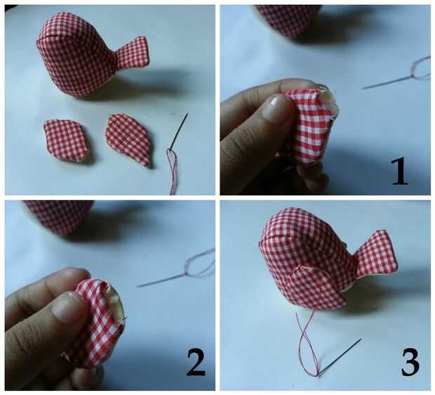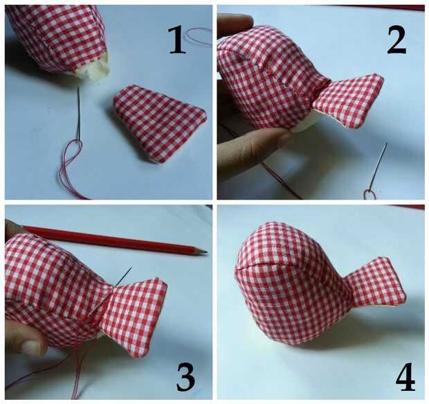 Ahora, fije la cola y las alas con el cuerpo relleno con hilo y aguja (ver figura).