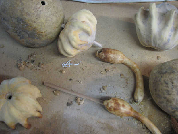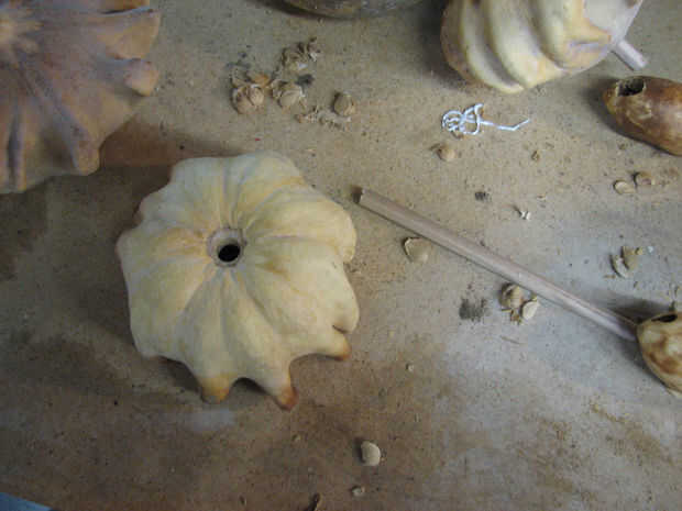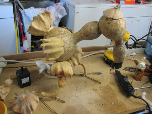Pegar las piezas es cuando el pájaro empieza a asumir su personalidad. Puede utilizar pedazos de madera espiga para unir algunas de las calabazas. En este caso, las piernas se hacen más fuertes mediante el uso de la espiga. Puede utiliza un taladro para hacer agujeros para los tacos. Perchas de alambre se utiliza para formar los pies. Otro pequeño agujero fue perforado en la base de las patas y el cable se deslizó en el agujero y pegado.
