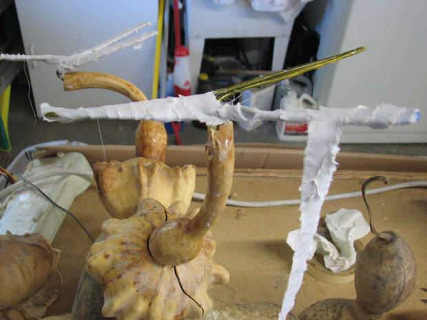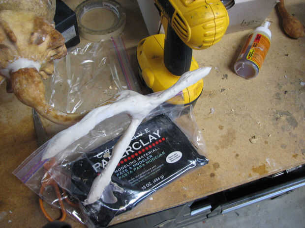 Largas tiras de tela de material de desecho se cubre con pegamento blanco y envuelto alrededor de las patas de alambre. Una vez seco el material puede agregar algunos arcilla de papel para plasmar los pies más.