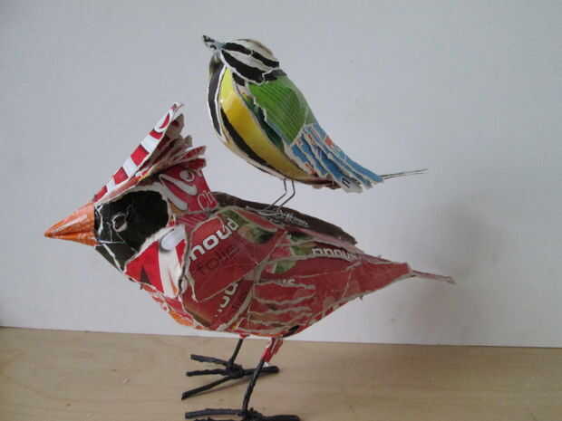 En todas las fotografías son ejemplos de otras aves para inspirarte y hacer tu propio! Dependiendo de la forma deseada y el tamaño variar la técnica. Por ejemplo, el pájaro rojo grande contiene un rollo de Pringles.