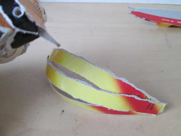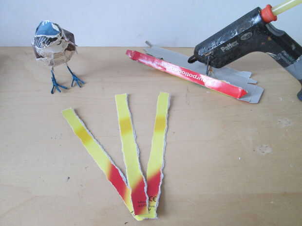 Rasgón de tres tiras de cartulina para la parte del pecho. Busque piezas que tienen el color correcto para el pájaro que te propongas hacer. Rasgado, le da un efecto más natural que corte. Los bordes irregulares de la blancos hacen una impresión de plumas y distorsionan la impresión en la caja original. Que le permite salirse con piezas de montaje mal bruja sería preocupante en piezas perfectamente cortadas.