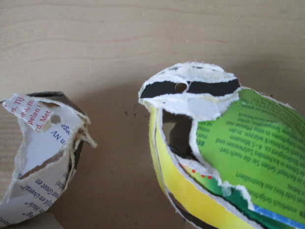 Rasgón de tres piezas de caja de cartón en forma de almendra. Uno para la parte superior de la cabeza, los otros dos para los lados. Doblar la parte superior de la cabeza e introducirlo en la franja posterior del hueso. Los puntiagudos lado af la almendra hacia el pico. Preparar los lados agregando las tiras de colores (si el pájaro tiene cualquiera) y perfore un agujero. Curva de la misma manera que hiciste con la parte superior un pegamento a las alas y el lado fuerte de la espalda hueso u órgano. La apertura a la izquierda debajo de la cabeza, entre las alas y el cuerpo posteriormente recubierta con un cuello negro. (ver siguiente paso) No importa si queda una pequeña abertura. El pájaro parecerá más "artístico" cuando se puede ver que el cuerpo no es masivo.