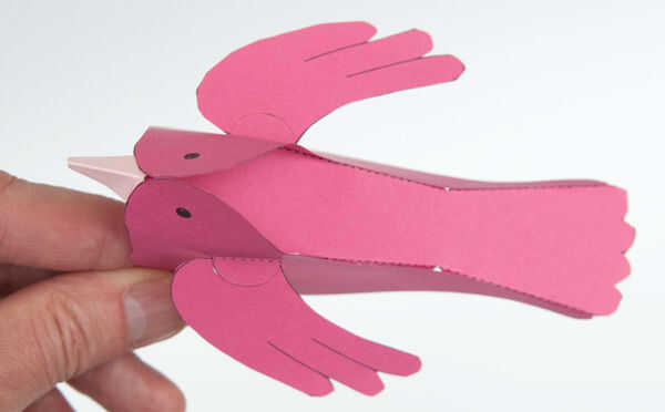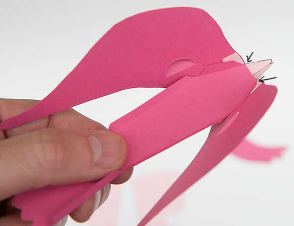 Pegar la parte superior del cuerpo en su lugar. Comience con el primer conjunto de lengüetas alineadas con la parte inferior del pico. (Flecha)