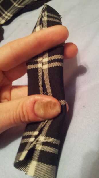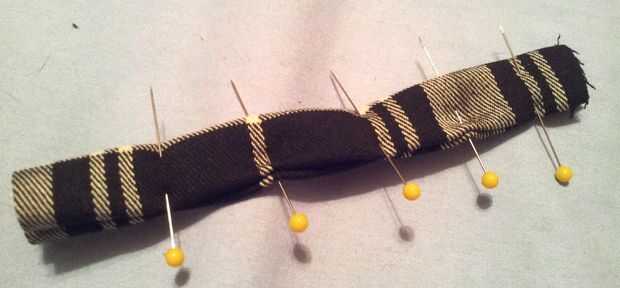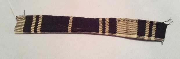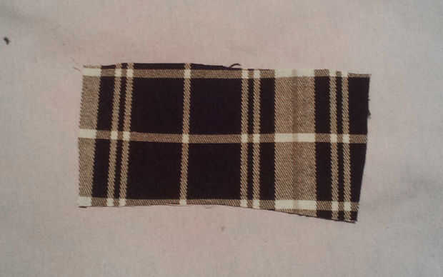 Un pequeño rectángulo para el bucle en la parte superior de la mochila de la tela escocesa... doble cuartos hacia adentro entonces en la mitad, perno, puntada, guardar para más tarde.