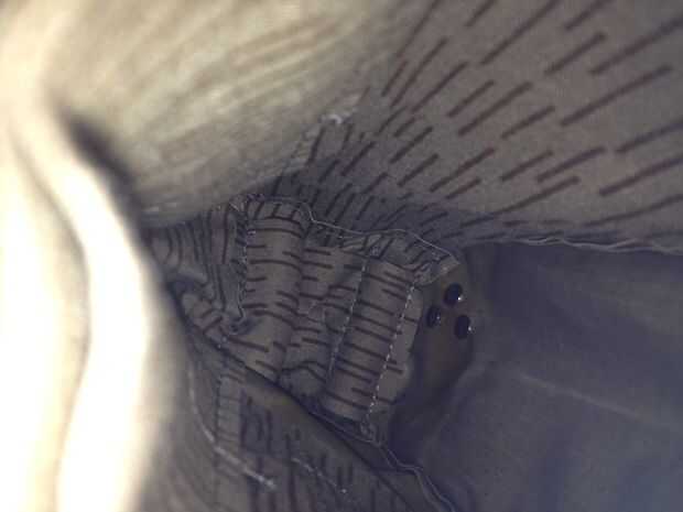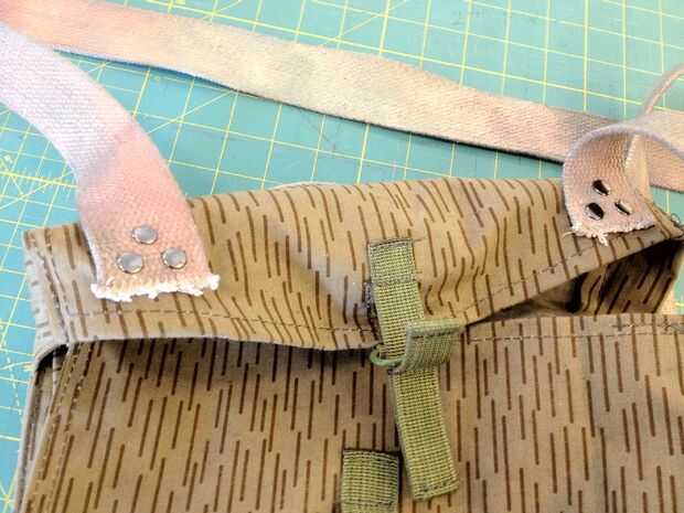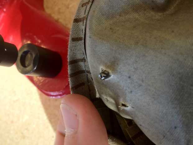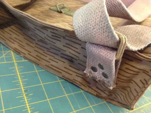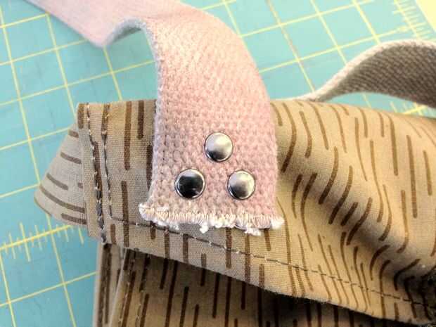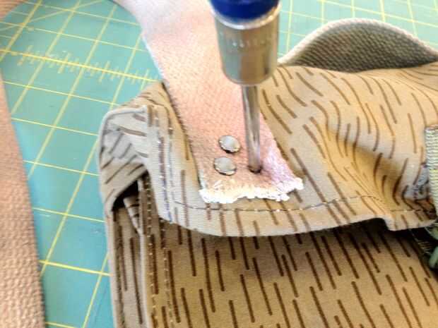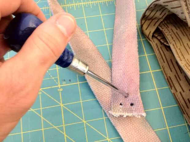 Usando un punzón perfora agujeros en las bandas y la bolsa