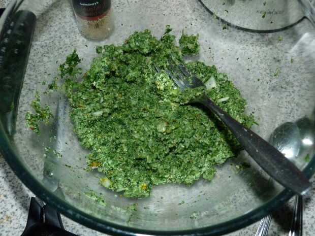 Resultan en un tazón y agregue suficiente harina para que puede convertirlos en bolas y a unir. Que comemos carbohidratos así que estamos trabajando hacia harina mínimo - debe hacer un par de cucharadas.