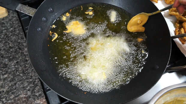 Paso 7: Dejar caer suavemente pequeños grupos en el aceite caliente con una cucharada o a mano