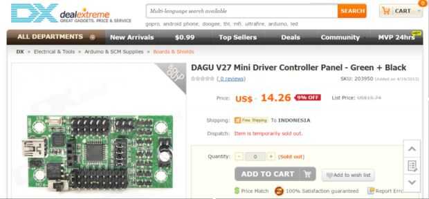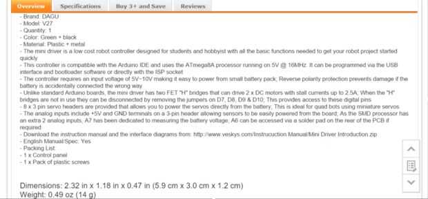 Encontré esto en el mercado que sonaba prometedor. Todo-en-uno Arduino microcontrolador compatible robot de apoyo 2 motores y servos micro 8. Se dice que hay un manual en inglés pero buscando en la web tengo poca información acerca de este controlador. Sí encontré pinouts y algunas historias de algunos chicos utilizando este controlador para su proyecto, pero pequeño detalle acerca de cómo conectarse y cómo código. Entonces tuve que descubrirlo yo mismo probando en él.