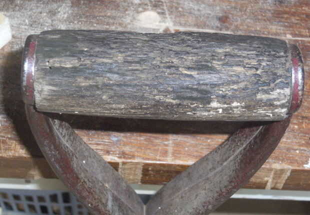 Muchas herramientas útiles Haz descartados porque el mango es roto a través de trabajo duro o abuso, y el propietario no puede o no completará la reparación. Esta parte posteriora del sólido, redondo inferior pala fue rescatada de la basura, buscando