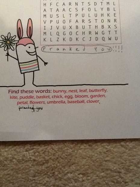 a broma alguien pregunte alguien si les gustaría probar esta búsqueda difícil palabra. Si te dicen que sí, ellos a mano este listado y ver como tratan de encontrar una sola palabra!!!:):) Lo que me gusta hacer bromas a personas con estas búsquedas de la palabra es hacerles sentirse bastante frustrado y luego decir, "oh, encontré una palabra". Y luego escribir en algún lugar debajo de las letras,"Pranked te" y luego del círculo de la palabra. Es muy gracioso!!!