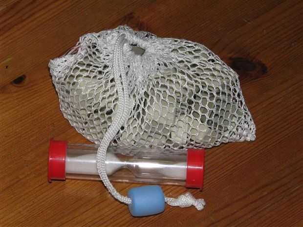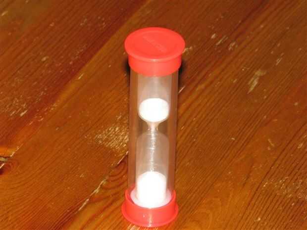 Los otros elementos esenciales son un temporizador de reloj de arena segunda 30 de otro juego y un cojín y un lápiz para guardar la cuenta.