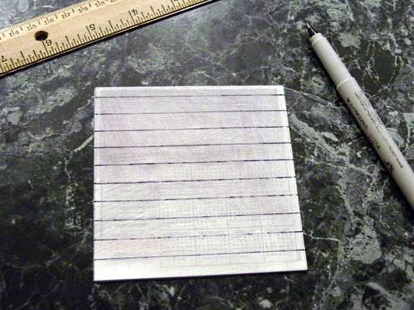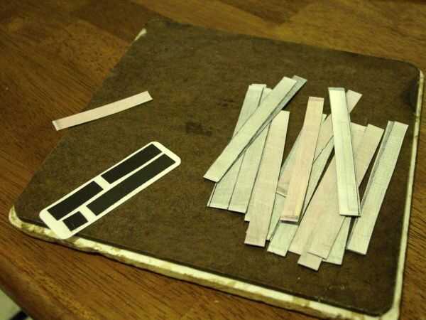 Una vez que tenga su base de bajo contraste, utilice una regla para marcar fuera de las tiras en el imán. Hice mis palabras un poco más 1/4" de ancho. Tu tiras con una cuchilla de afeitar o un par de tijeras y empezar a aplicar las tiras a su material de la etiqueta engomada, lado imán hacia arriba. Utilice fuerza firme para obtener buena adherencia, luego corte que tiras de su imán del material de la etiqueta engomada.