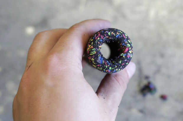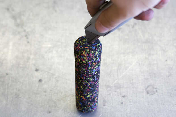Corte un agujero en el extremo cerrado de la espuma apretones de bicicleta para que queden huecos a través de todo el camino.