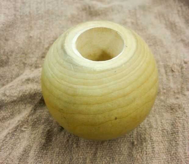 Siguiente paso es perforar en el centro de la plana hasta una profundidad de 1.5" según los dibujos en el paso 1. Utilice lo 3/4" forstner poco para ello. Proteger la madera puede ser difícil así que lo que hice fue usar un rollo de cinta como una base para mantener la pelota en su lugar y firmemente sujeta con la mano. Brocas Forstner están bastante suaves perforación sujetándola con la mano no es un problema pero puede que necesite explorar otra forma de sostenerla si usas una pala poco o similar. Si usando una broca de taladro no demasiado profunda porque el punto puede salir de la parte superior de la esfera!