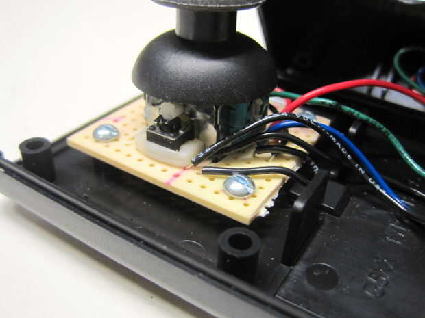 - Agujeros de taladro o dremel para los cuatro puntos de montaje mecánico en el joystick. Forman un cuadrado,. 6" por. 6"; el patrón en la Junta de centro. De nuevo, puede utilizar los orificios existentes como agujeros del arrancador. El taladro de 1/8" puede ser un poco grande para esto si vas a perforar hacia fuera, así que usar algo más pequeño si lo tienes.