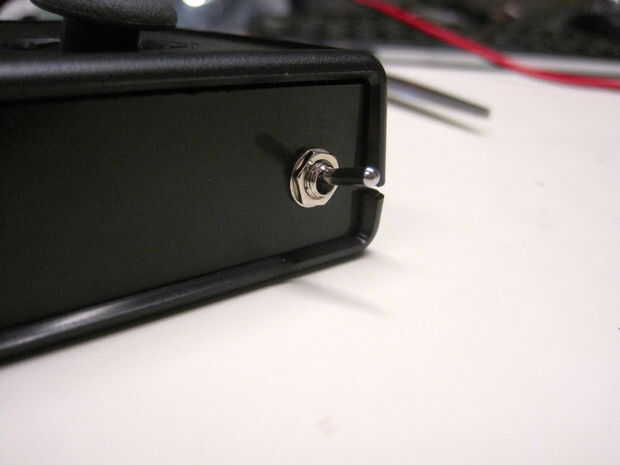 - Instale el interruptor de alimentación en la placa de extremo. Retire la tuerca de la parte roscada del interruptor (si está instalado), el interruptor de alimentación a través del orificio de 3/16" que ha perforado y fijarla con la tuerca. Apretar suavemente con una llave ajustable.