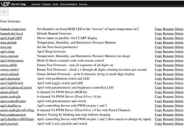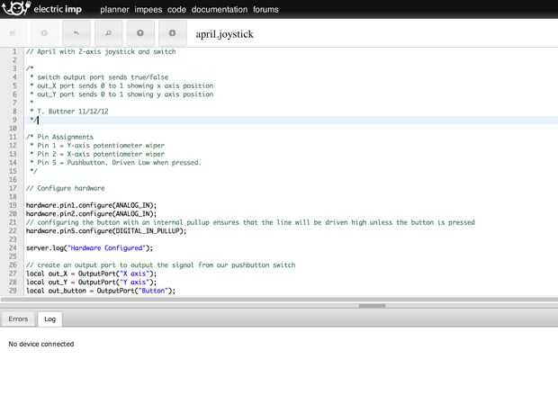 - Ahora verás a la eléctrica imp IDE en su navegador. Pegue el código en la ventana y golpeó "guardar" (el botón de disco en la parte superior derecha). Cuando se guarda el código, haga clic en "plan" en la parte superior para volver al planificador.