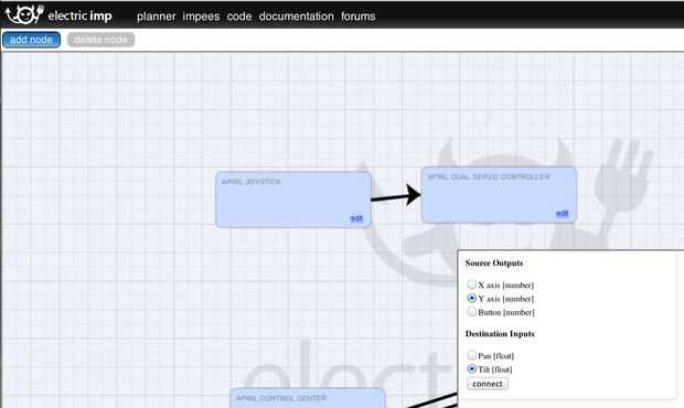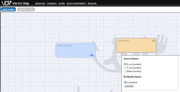 - Conectar el joystick a algunos otros nodos para control cosas! Para hacer una prueba rápida, utilice el botón de "Agregar nodo" para agregar tres nodos "ver entrada", luego haga clic y arrastre desde el "+" en la esquina superior derecha de su nodo de joystick a cada uno de estos nodos, el eje x, eje y y el botón de conexión a cada uno. Ahora usted debería ser capaz de ver los valores cambian al mover la palanca de mando o pulse el botón. Puede utilizar el mismo procedimiento para "conectar" el joystick hasta cualquier cosa que se salvo un número como entrada - como el impBot!